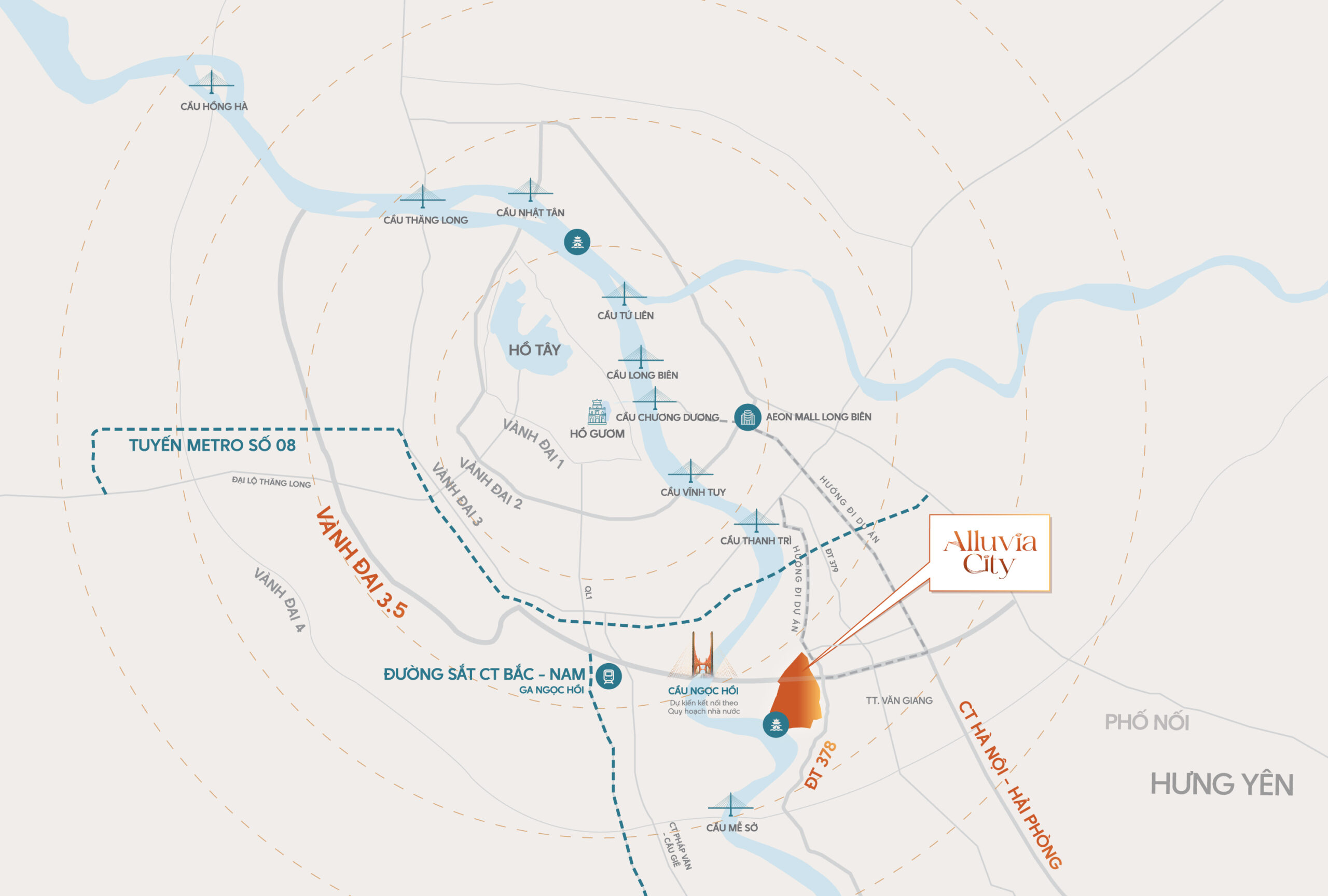 Với các cây cầu nối hai bờ sông Hồng và là cửa ngõ phía Đông Nam Hà Nội qua đường cao tốc 5B Hà Nội – Hải Phòng, từ dự án tới hồ Hoàn Kiếm sẽ không quá 35 phút khiến khu đô thị này là điểm đến thuận tiện cho cư dân tại các khu phố cổ Hoàn Kiếm hay các Quận Ba Đình, Tây Hồ. Dự án cũng được kết nối với Ngã Tư Sở, Ngã Tư Vọng – các địa danh quen thuộc từ lâu đời của Hà Nội bằng đường vành đai 2 trên cao chỉ 30 phút di chuyển. Là điểm đến thuận tiện của cư dân Quận Hai Bà Trưng, Hoàng Mai, Đống Đa, Thanh Xuân.