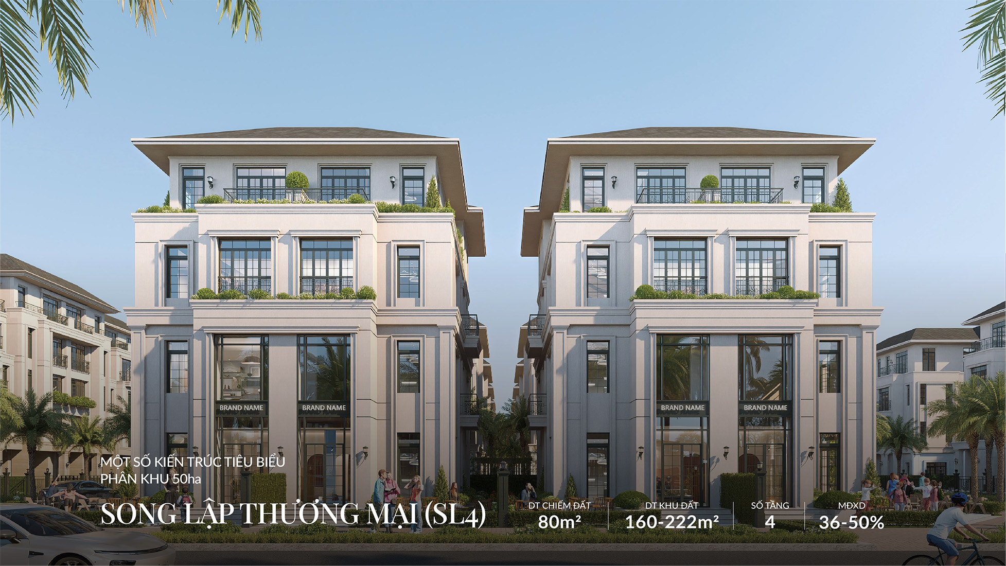- Biệt thự song lập thương mại: có diện tích từ 166 – 222 m2, được bố trí tại các tuyến đường sầm uất, loại hình này đặc biệt phù hợp cho mô hình vừa ở vừa kinh doanh. Tầng 1 có thể khai thác thương mại như mở cửa hàng, quán cà phê, dịch vụ cao cấp, trong khi các tầng trên vẫn giữ vai trò là không gian sinh hoạt gia đình. Với lợi thế này, biệt thự song lập thương mại tại Alluvia City đáp ứng xu hướng kết hợp an cư và kinh doanh ngày càng phổ biến tại các đô thị hiện đại.