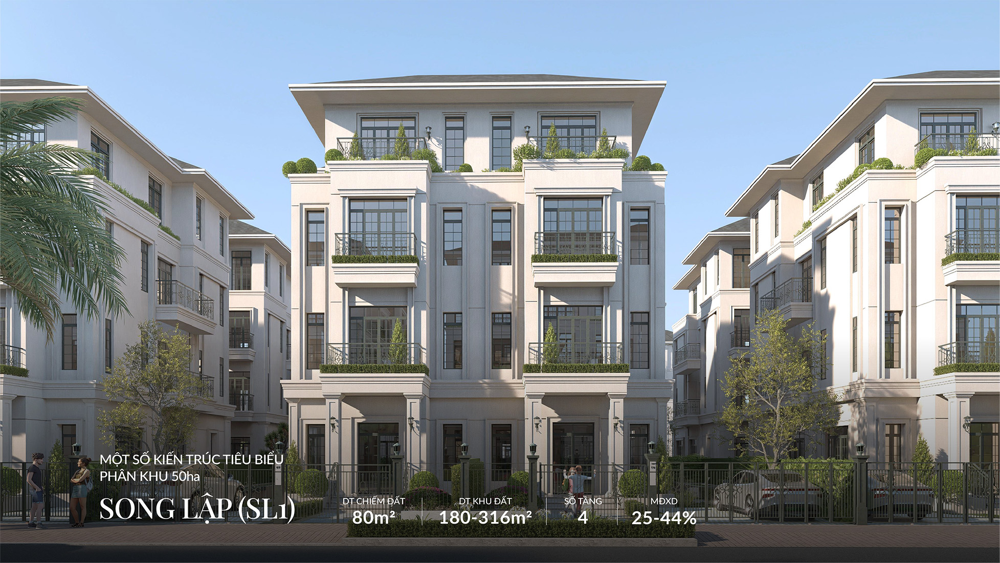 - Biệt thự song lập: Các căn song lập có diện tích từ 180 m2 – 316m². Thiết kế 4 tầng, 2 mặt thoáng cùng lối đi riêng biệt mang lại sự thông thoáng, đồng thời vẫn đảm bảo sự kết nối và giao lưu trong cộng đồng cư dân. Đây là lựa chọn phù hợp với những gia đình trẻ hoặc chủ nhân mong muốn vừa có không gian riêng, vừa dễ dàng mở rộng các mối quan hệ xã hội.
