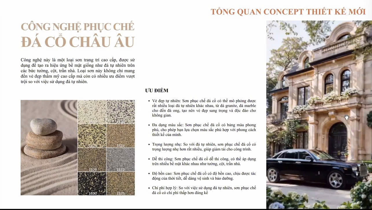 Công nghệ này được phát triển dựa trên triết lý “gìn giữ giá trị cổ điển bằng phương pháp bền vững”. Nhờ phối trộn hạt đá tự nhiên theo tỷ lệ chuẩn, lớp hoàn thiện mang cấu trúc vật lý tương tự đá thật: độ cứng, độ bóng và sắc vân sống động. Tuy nhiên, trọng lượng nhẹ hơn đáng kể, giúp giảm tải cho kết cấu công trình mà vẫn đảm bảo tính thẩm mỹ cao.