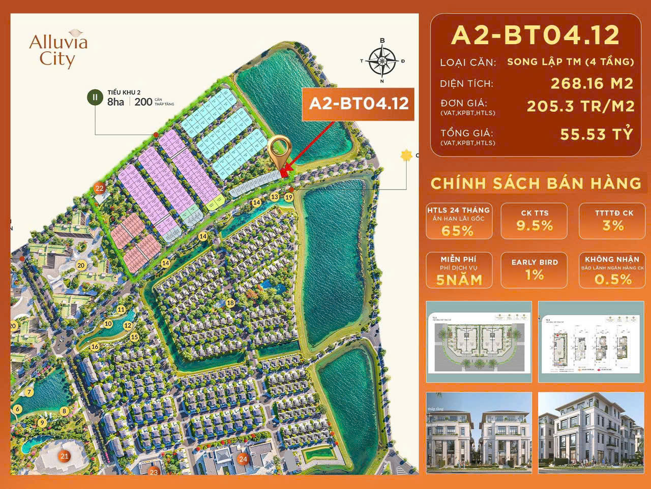 Căn A2-BT04.12 sở hữu vị trí vàng trên trục đường 24m, là “cửa ngõ” đón dòng du khách từ con đường di sản, đảm bảo lưu lượng khách ổn định cho hoạt động kinh doanh. Tiếp giáp hồ điều hòa tạo không gian cảnh quan thoáng đãng, phù hợp cho mô hình F&B, nhà hàng hay dịch vụ trải nghiệm.