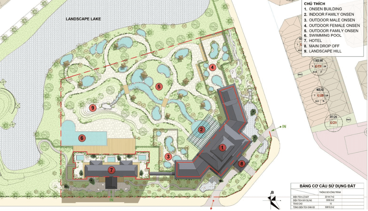 - Onsen Building: Tòa nhà trung tâm tổ chức các dịch vụ ngâm, xông, trị liệu khoáng nóng theo phong cách Nhật Bản.