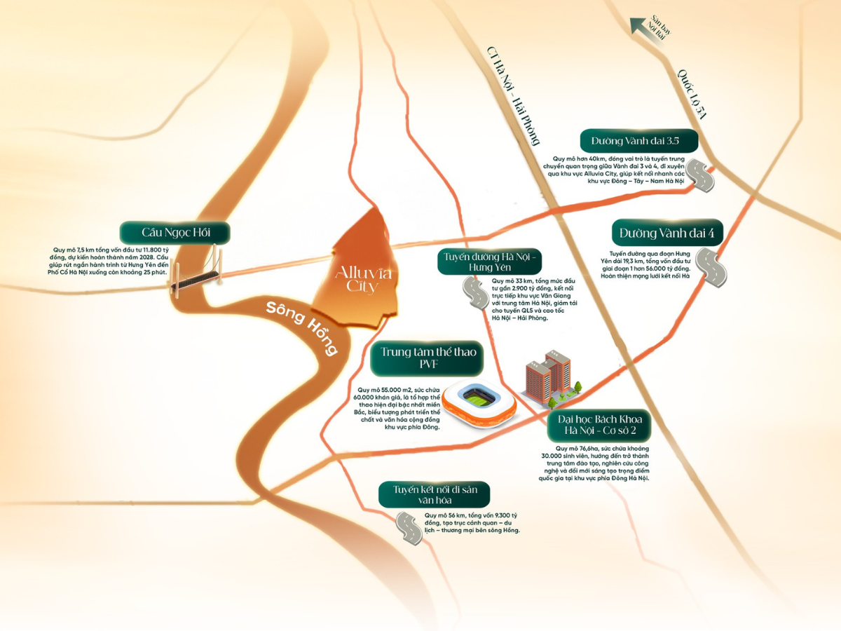 Hai công trình trọng điểm này – sân vận động quốc tế và cơ sở đại học quy mô lớn – được xem là “đòn bẩy” quan trọng cho giá trị bất động sản tại khu vực. Với vị trí nằm trong trục phát triển Đông Bắc Thủ đô, Alluvia City sẽ hưởng lợi trực tiếp từ tốc độ đô thị hóa và làn sóng dịch chuyển dân cư về phía Đông.